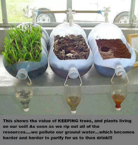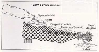 Wetland in a Bottle. We did this activity on a troop camping trip. We brought a couple of empty 2-liter plastic soda bottles precut, then asked the girls to gather up the soil, grass, leaves, small rocks, etc. from around the campsite to make their own wetland. Best to use some dirty water with grass, etc. floating in it, so the scouts get the idea of how the wetlands clean the water. We made sure to show them the "cleaner" water coming out of the spout and ask them if it looked like what they saw on a hike down to a local river (about the same color). www.randwater.co.za/CorporateResponsibility/WWE/Pages/WetlandModel.aspx File:Building a model of a Wetland.docx Wetland in a bottle trio. If you have more time and/or some place to leave plants to grow over a week or two, you could try this.